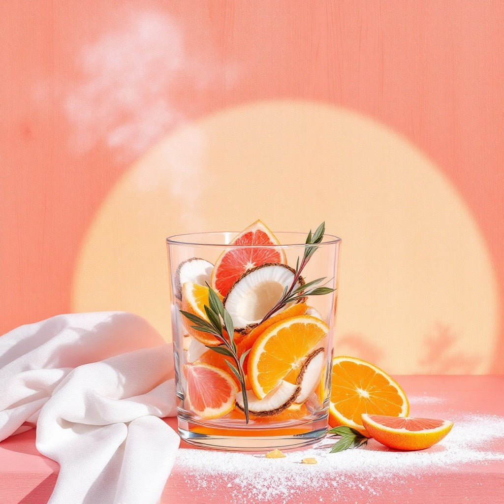 A fresh, clean blend of cotton, sweet coconut, and dry wood with hints of musk, clean powder, and bright orange and grapefruit notes.